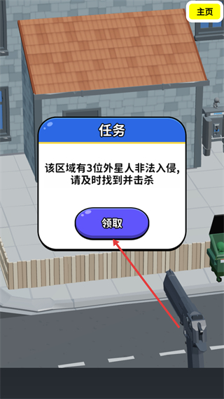 1、看到【任務(wù)】彈窗,點擊【領(lǐng)取】按鈕接取任務(wù),目標(biāo)是找到并擊殺該區(qū)域內(nèi)的【3位外星人非法入侵】,開啟對應(yīng)關(guān)卡挑戰(zhàn)。