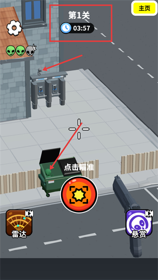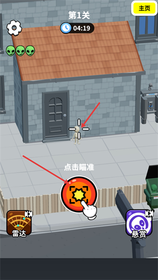 2、進(jìn)入【第1關(guān)】后,根據(jù)提示點擊瞄準(zhǔn)按鈕,鎖定外星人目標(biāo),同時可借助界面的【雷達(dá)】功能輔助定位目標(biāo)。
