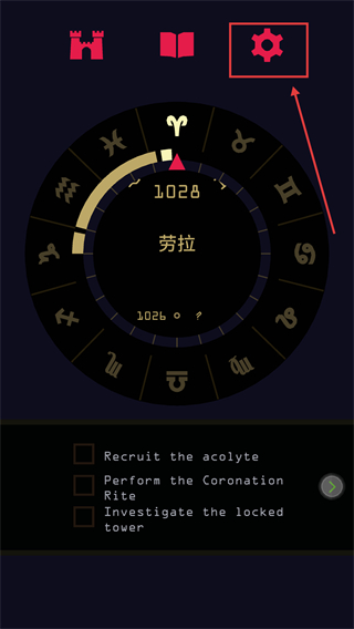 1、點擊界面中的【設置】按鈕,同時留意當前任務如【Recruit-the-acolyte】,后續(xù)可通過完成這類任務推進游戲劇情與統(tǒng)治進程。