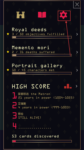 2、進入【設置】界面后,查看【Royal-deeds】等統(tǒng)計項,了解當前統(tǒng)治進度,后續(xù)可通過完成目標解鎖新卡牌與劇情內(nèi)容。