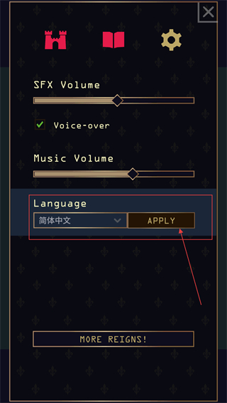 4、將【Language】切換為【簡體中文】后,點擊【APPLY】按鈕,應用該語言設置,以便更順暢地參與統(tǒng)治相關(guān)操作。
