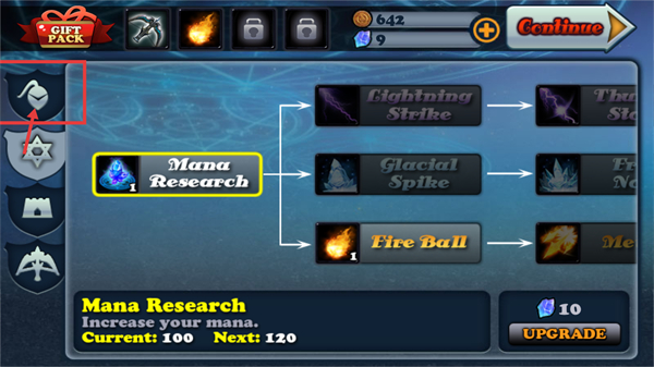 1、選擇【Mana-Research】選項(xiàng),消耗對應(yīng)資源升級法力屬性,提升法力上限(當(dāng)前100→下一階段120),為技能釋放提供基礎(chǔ)。