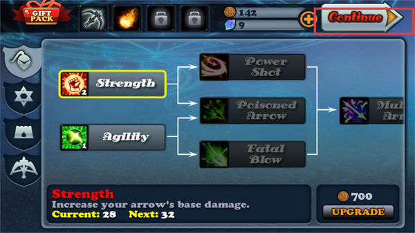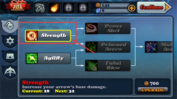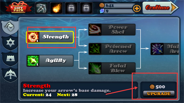 2、切換到【Strength】屬性界面,消耗500金幣點(diǎn)擊【UPGRADE】按鈕,提升箭矢基礎(chǔ)傷害(當(dāng)前24→下一階段28),增強(qiáng)輸出能力。