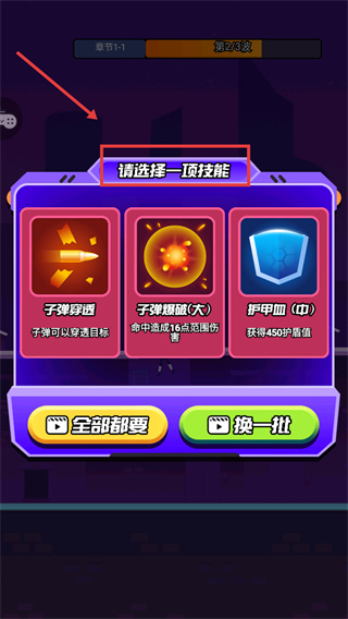 2、進(jìn)入【第2/3波】后,選擇【子彈穿透】技能,可讓子彈穿過多個(gè)目標(biāo),提升群體輸出效率。