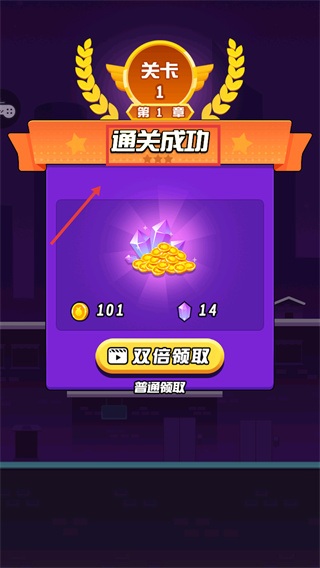 4、通關(guān)【第1章-關(guān)卡1】后,選擇【普通領(lǐng)取】獲取【101】金幣與【14】鉆石,或看視頻【雙倍領(lǐng)取】獎(jiǎng)勵(lì)。