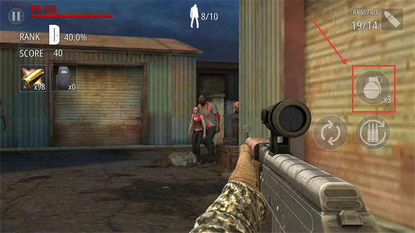 3、當敵人較多時,可使用【x3】手雷進行范圍攻擊,快速清場,同時注意彈藥【19/14】的剩余情況。