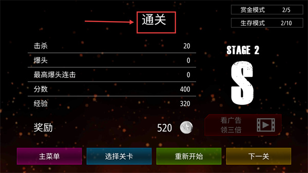 4、達成【通關】后,可選擇【下一關】繼續(xù)挑戰(zhàn),也能看廣告領三倍【520】獎勵提升資源儲備。