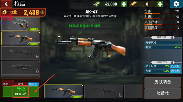 4、在槍店消耗【1800】金幣升級【AK-47】,可提升其傷害、射速等屬性,增強(qiáng)戰(zhàn)斗能力。