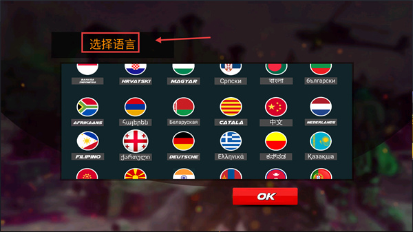 1、進(jìn)入游戲先在語言選擇界面選中【中文】,再點(diǎn)擊【OK】確認(rèn),確保后續(xù)操作界面為熟悉語言。