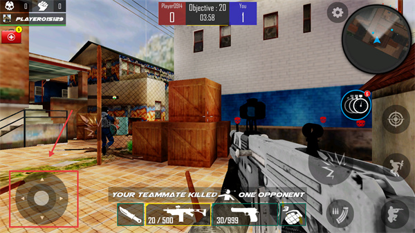 2、戰(zhàn)斗時(shí)操控左下角【移動(dòng)鍵】調(diào)整位置,配合武器瞄準(zhǔn)對(duì)手,留意隊(duì)友擊殺提示來協(xié)同作戰(zhàn)。
