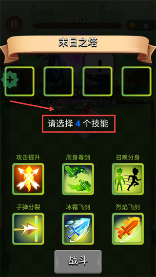 1、進入【末日之塔】后,需選擇【4個技能】搭配出戰(zhàn),選完后點擊【戰(zhàn)斗】開啟關卡。