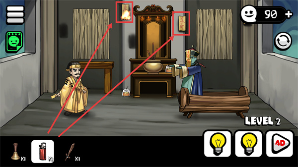 3、點(diǎn)擊箭頭指向的【符咒】類(lèi)物品,觸發(fā)燃燒效果,底部道具欄會(huì)更新新增道具,完成該步驟的關(guān)卡互動(dòng)要求。