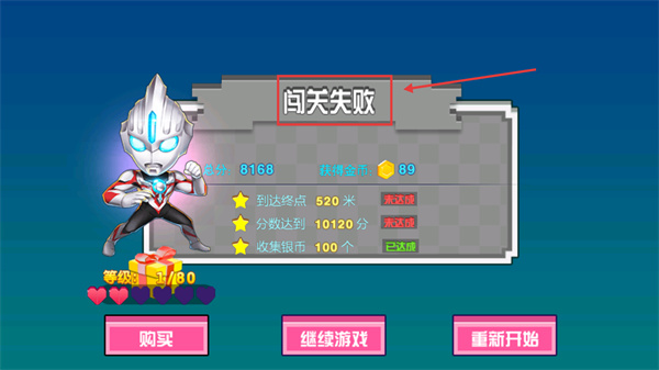 4、若出現(xiàn)【闖關(guān)失敗】,點(diǎn)擊【重新開(kāi)始】重試關(guān)卡,再?zèng)_終點(diǎn)。