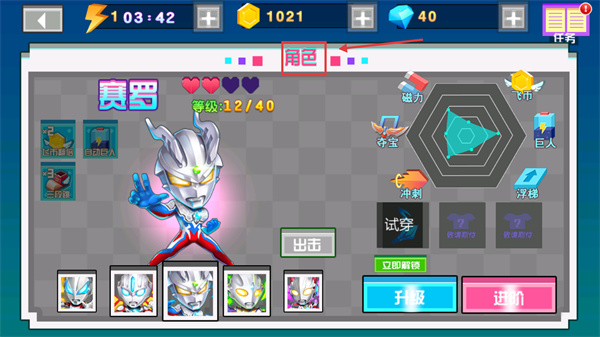 4、在【角色】界面選擇【賽羅】后點(diǎn)擊【出擊】,可升級角色提升屬性;解鎖新角色能獲得不同技能。