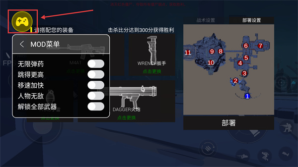 2、在裝備界面可開啟【MOD菜單】功能(如無限彈藥),同時(shí)搭配武器與戰(zhàn)術(shù),按地圖部署推進(jìn)關(guān)卡更高效。