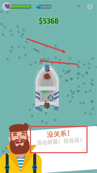 1、進入游戲后按提示滑動屏幕操控釣線,當前持有【$5368】,該操作簡單易上手,可快速開啟垂釣流程,順利進入游戲節(jié)奏。