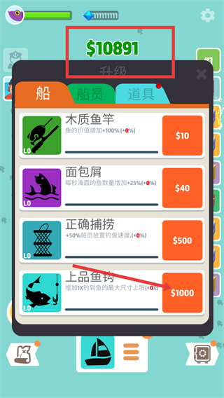 2、在升級界面可選購【木質魚竿】【上品魚鉤】等道具,當前持有【$10891】,消耗對應金額購買能提升垂釣的收益與效率,優(yōu)化垂釣體驗。