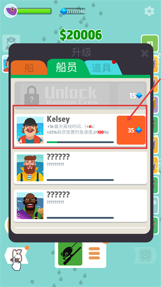 4、在船員-界面可解鎖【Kelsey】,需消耗【35】個鉆石,該船員能增加最大垂釣時間與放置-速度,當前持有【$20006】。