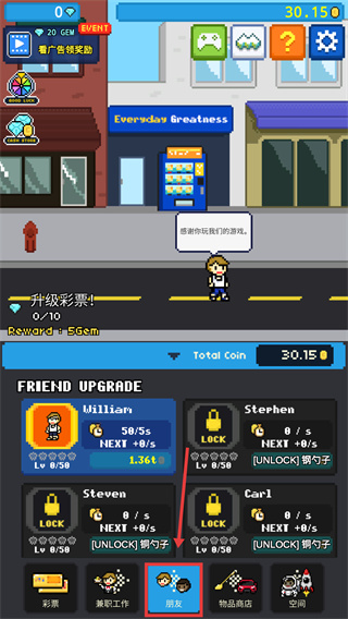 3、在【朋友】界面,升級(jí)已解鎖的好友(如William),可提升每秒金幣收益,其他好友需解鎖道具后開啟。