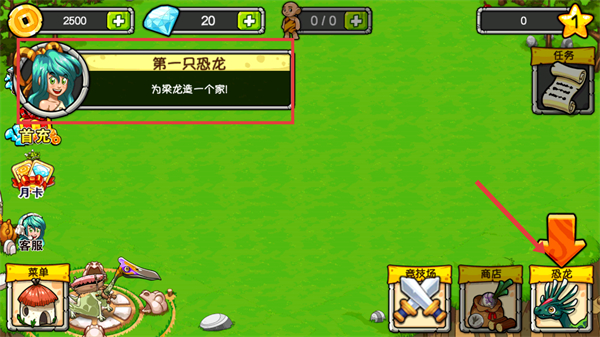 1、看到界面提示【為恐龍建一個家!】,點擊界面右下角的【恐龍】按鈕,進(jìn)入恐龍操作界面,這是推進(jìn)初始養(yǎng)恐龍流程的關(guān)鍵步驟。