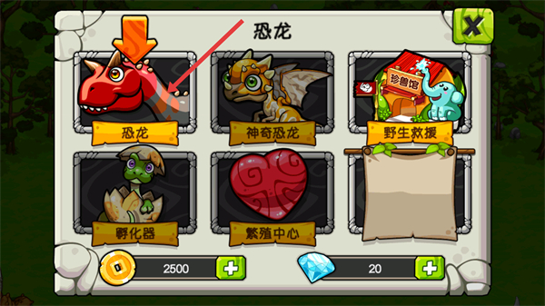 2、進(jìn)入【恐龍】界面后,可選擇【恐龍】獲取初始恐龍,還能看到【孵化器】【繁殖中心】等功能,當(dāng)前可用【2500-金幣】【20-鉆石】進(jìn)行相關(guān)操作。