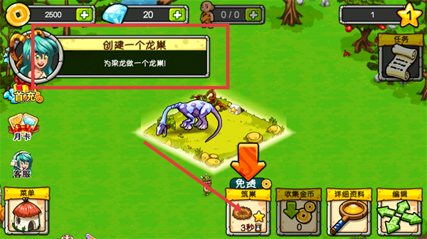 4、看到界面提示【創(chuàng)建一個龍巢-為恐龍做一個龍巢!】,點擊下方【筑巢】按鈕,等待3秒即可完成龍巢創(chuàng)建,助力恐龍安置。