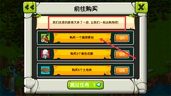 1、進(jìn)入【前往購(gòu)買(mǎi)】任務(wù)界面,看到【購(gòu)買(mǎi)一個(gè)蔬菜驛站-0/1】等子任務(wù),可按提示完成購(gòu)買(mǎi),也能消耗1鉆石選【跳過(guò)任務(wù)】推進(jìn)流程。
