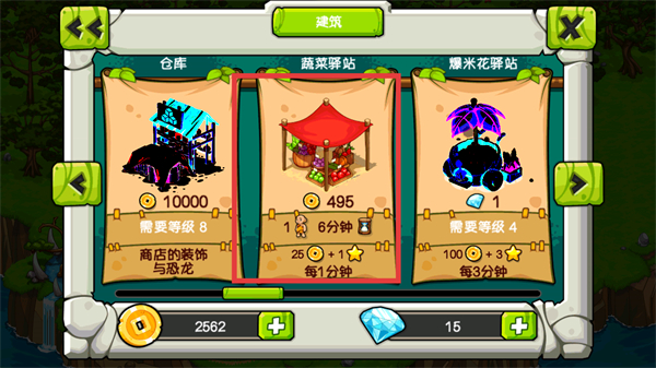 2、在建筑界面選定【蔬菜驛站】,其消耗【495-幣】,6分鐘建成后每1分鐘產(chǎn)出【25-幣+1-星】,助力資源持續(xù)積累。