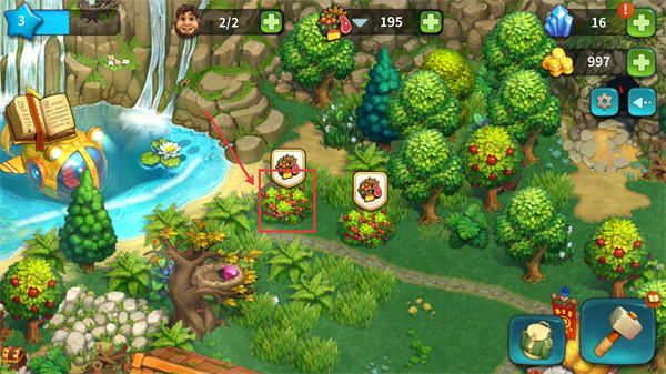 2、關(guān)注界面中帶紅框標(biāo)注的資源點(diǎn),點(diǎn)擊可獲取對(duì)應(yīng)道具,同時(shí)留意頂部的【2/2】-【195】等資源數(shù)值。