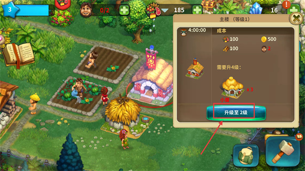2、查看【主樓-(等級(jí)1)】的升級(jí)界面,確認(rèn)【成本-100】等資源足夠后,點(diǎn)擊【升級(jí)至2級(jí)】提升建筑等級(jí)。