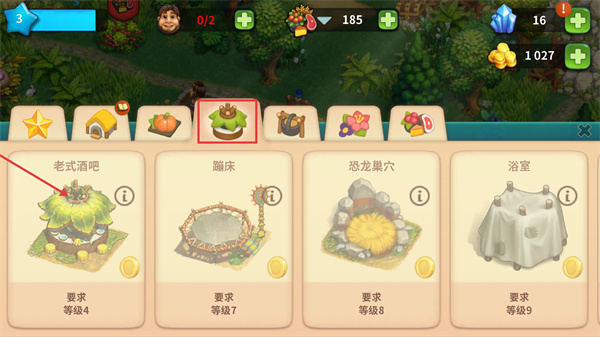 3、在建筑解鎖界面中,留意【老式酒吧】等建筑的【要求-等級(jí)4】,提前規(guī)劃等級(jí)提升節(jié)奏以解鎖新建筑。