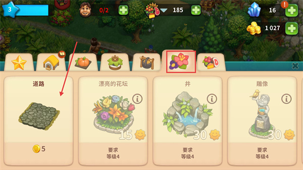 4、切換建筑選項(xiàng)卡后,選擇【漂亮的花壇】,消耗對(duì)應(yīng)資源解鎖,可豐富部落裝飾并提升區(qū)域?qū)傩浴?