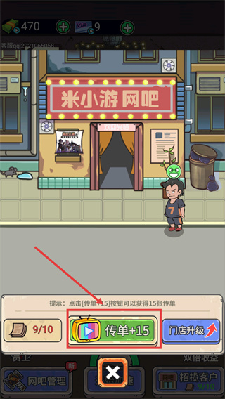 3、點(diǎn)擊【傳單+15】按鈕可獲取傳單道具,用于吸引更多客戶(hù),留意界面提示的功能按鈕作用。