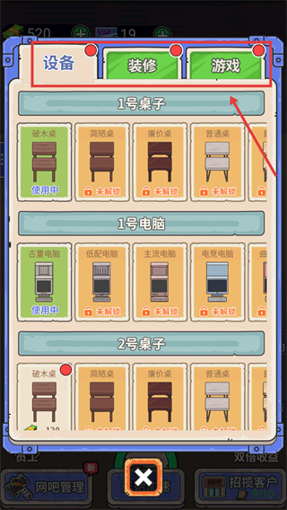4、進(jìn)入【設(shè)備】界面,可查看并升級(jí)桌椅、電腦等設(shè)施,解鎖更高級(jí)的設(shè)備能提升網(wǎng)吧的服務(wù)能力與收益。