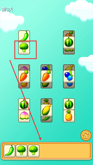 3、點擊【西蘭花】方塊移入收集欄,三個相同的進行消除。