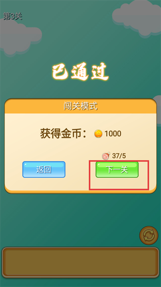 4、通關(guān)【第3關(guān)】可領(lǐng)取【1000】金幣獎勵,點擊【下一關(guān)】按鈕繼續(xù)挑戰(zhàn)。
