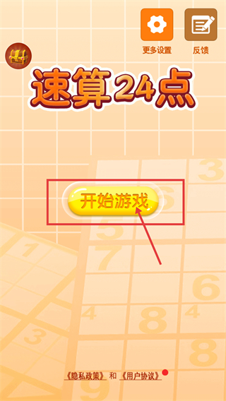 1、在速算24點(diǎn)界面,點(diǎn)擊紅色框選的開(kāi)始游戲按鈕,進(jìn)入個(gè)人挑戰(zhàn)關(guān)卡,開(kāi)啟以湊24為目標(biāo)的運(yùn)算解題環(huán)節(jié)。