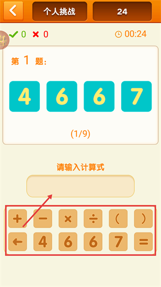 2、進(jìn)入第1題后,結(jié)合紅色框選的運(yùn)算按鍵,利用給出的4、6、6、7,嘗試組合運(yùn)算式來(lái)湊出24,推進(jìn)解題。