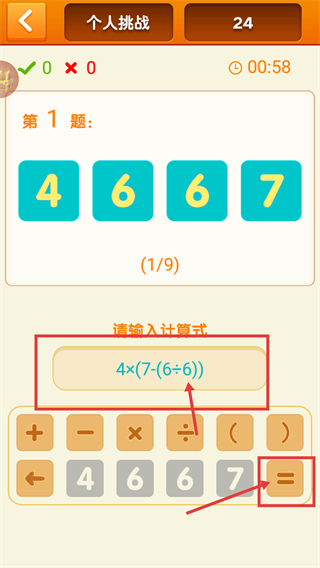 3、通過(guò)運(yùn)算按鍵輸入算式(如4×(7-(6÷6))),點(diǎn)擊紅色框選的等號(hào)提交答案,完成該題的運(yùn)算驗(yàn)證。