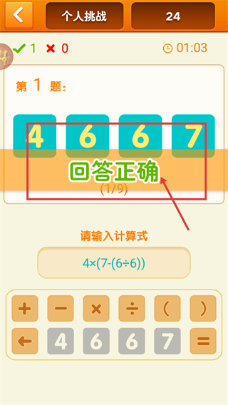 4、提交后出現(xiàn)“回答正確”提示,完成本次速算24點(diǎn)的第1題,可繼續(xù)參與后續(xù)的運(yùn)算題目挑戰(zhàn)。