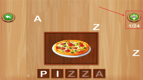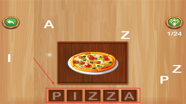 2、根據(jù)畫面中的物品(如披薩),將對應(yīng)字母【P-I-Z-Z-A】按順序拼接,完成單詞拼寫推進(jìn)關(guān)卡。