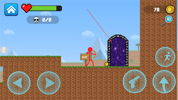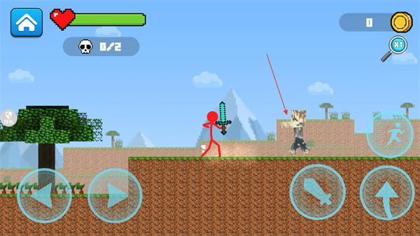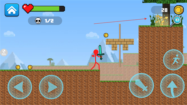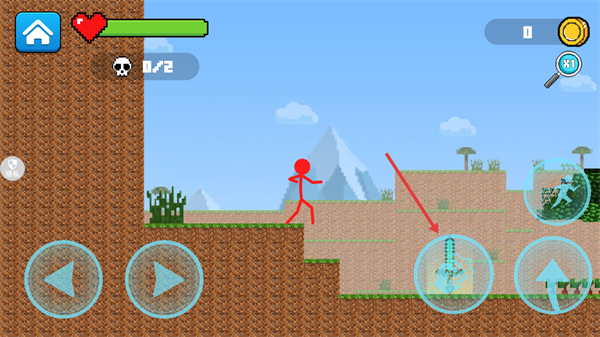 1、初始關(guān)卡通過方向鍵控制火柴人移動(dòng),點(diǎn)擊工具按鈕收集資源,同時(shí)注意躲避危險(xiǎn)區(qū)域。