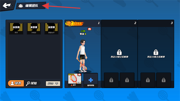 2、進(jìn)入【編輯團(tuán)隊(duì)】界面,當(dāng)前僅解鎖【小帥】,后續(xù)需提升等級解鎖更多隊(duì)員,可搭配球拍增強(qiáng)戰(zhàn)力。