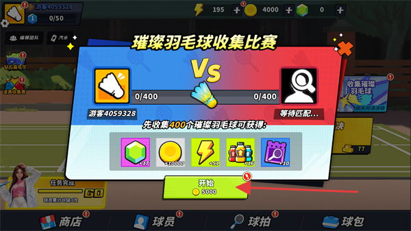 4、參與【璀璨羽毛球收集比賽】,消耗資源點(diǎn)擊【開始】,先收集【400】個璀璨羽毛球即可獲取獎勵。