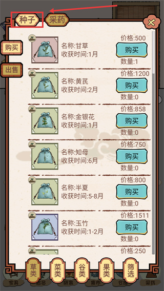 1、在【種子】界面選擇對應(yīng)藥材,根據(jù)收獲時間和價格購買,提前規(guī)劃種植周期。