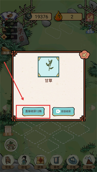 3、藥材成熟后點擊【直接收獲12株】獲取資源,也可選擇雙倍收獲來提升單次收益效率。