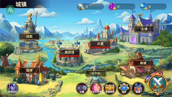 1、在【城鎮(zhèn)】界面,可通過(guò)【主城】【兵營(yíng)】等建筑提升戰(zhàn)力,還能借助【石中劍】等功能獲取戰(zhàn)斗增益,點(diǎn)擊出征即可戰(zhàn)斗。