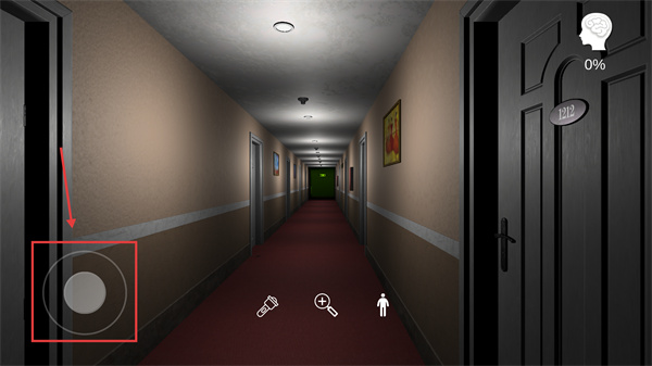 1、進入走廊場景后,通過左側(cè)的移動按鈕操控角色移動,探索如【1212】房間等區(qū)域,推進解謎進度。