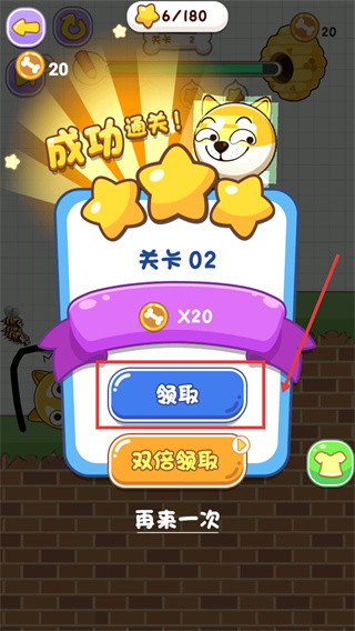 4、通關(guān)后點擊【領(lǐng)取】按鈕可獲取【20】個骨頭獎勵,積累道具用于解鎖后續(xù)內(nèi)容或功能。