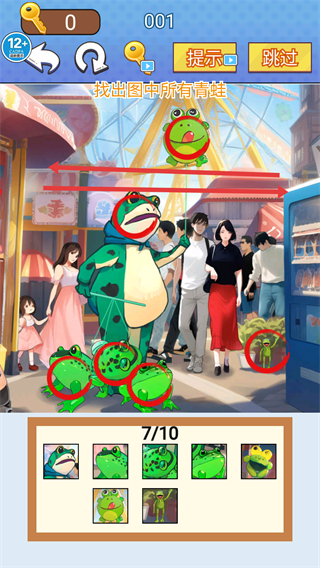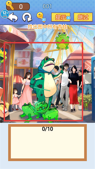 2、觀察場景,識別圖中的青蛙元素,當(dāng)前進度顯示【0/10】,開始點擊目標(biāo)青蛙。